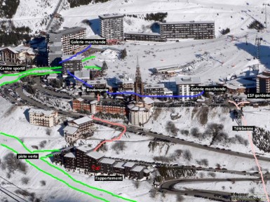 Une piste verte longe l'immeuble. Elle vous permet de partir tranquillement skier, soit vers la pointe de la masse (très ensoleillée le matin) ou soit pour prendre le télésiège du Doron ou du Reberty afin de découvrir tout les domaines (Ménuires, Vallée des Bellevilles ou 3vallées).